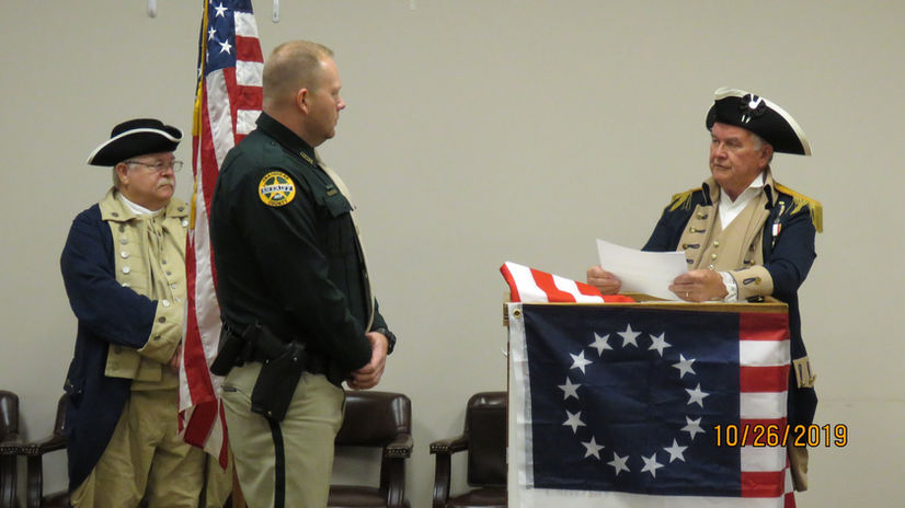 At the January 12, 2019 meeting Captain Augustine was awarded the Law Enforcement Award by President Dick O’Connell of the Gen. Lafayette Chapter SAR with 18 Compatriot members in attendance. Captain Augustine is a recent graduate of the FBI Academy, has been in law enforcement for 26 years (15 for the Sheriff’s Department), and is married to a deputy sheriff. He has 3 children and 3 grandchildren. Congratulations and THANK YOU for your service!